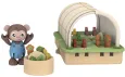 This set includes a greenhouse, compost bin, rake, trowel, watering can, vegetable basket, four compost layers, two plots of lentils, four carrots, two cabbages and two tomatoes.
