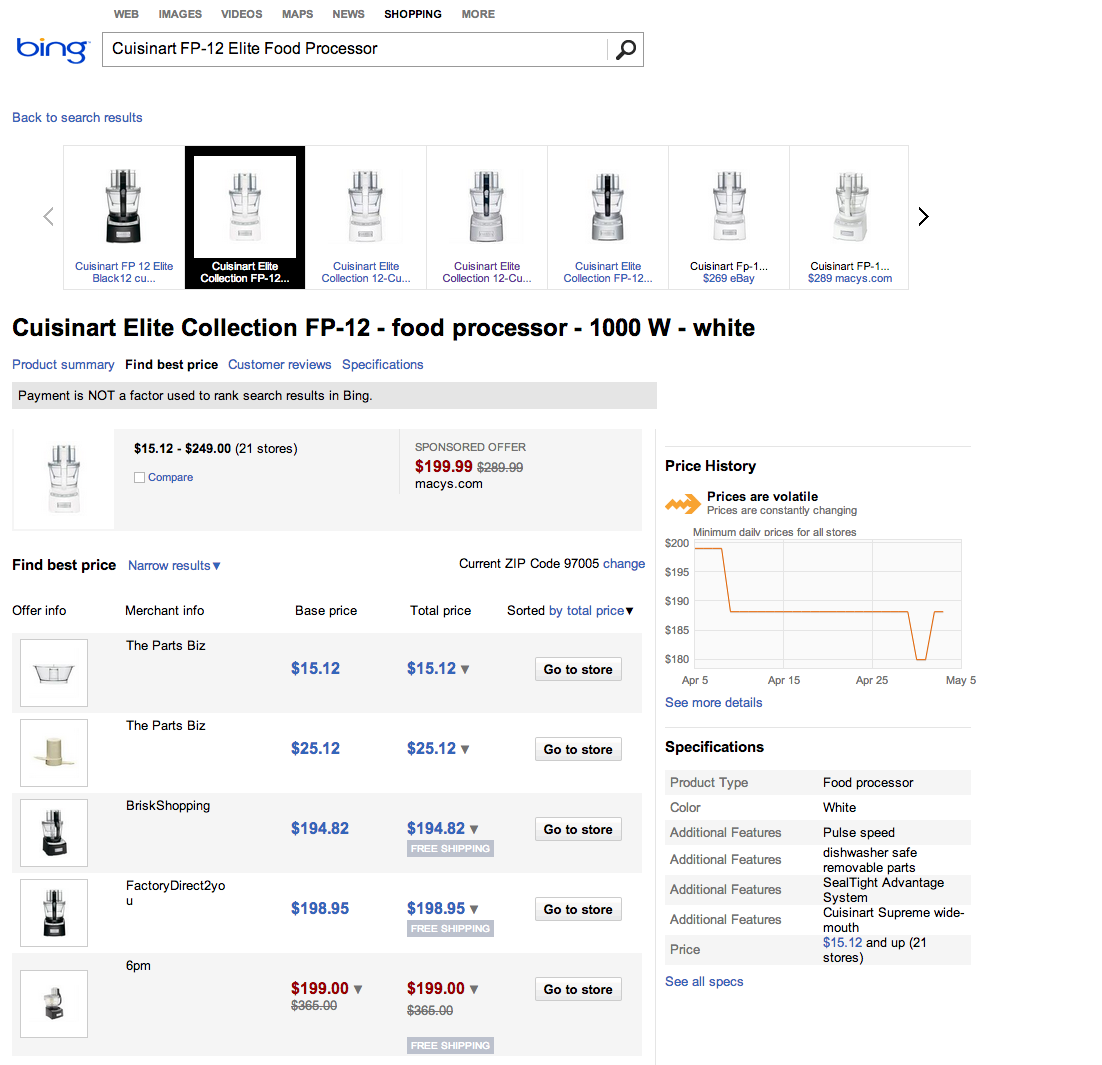 Amazon does appear in Bing results, but it may not be the Amazon you’re looking for. In a recent search for the “Cuisinart FP-12 Elite Food Processor,” an Amazon Marketplace listing appeared for $188, even though Amazon.com carries it for $184. Oops.