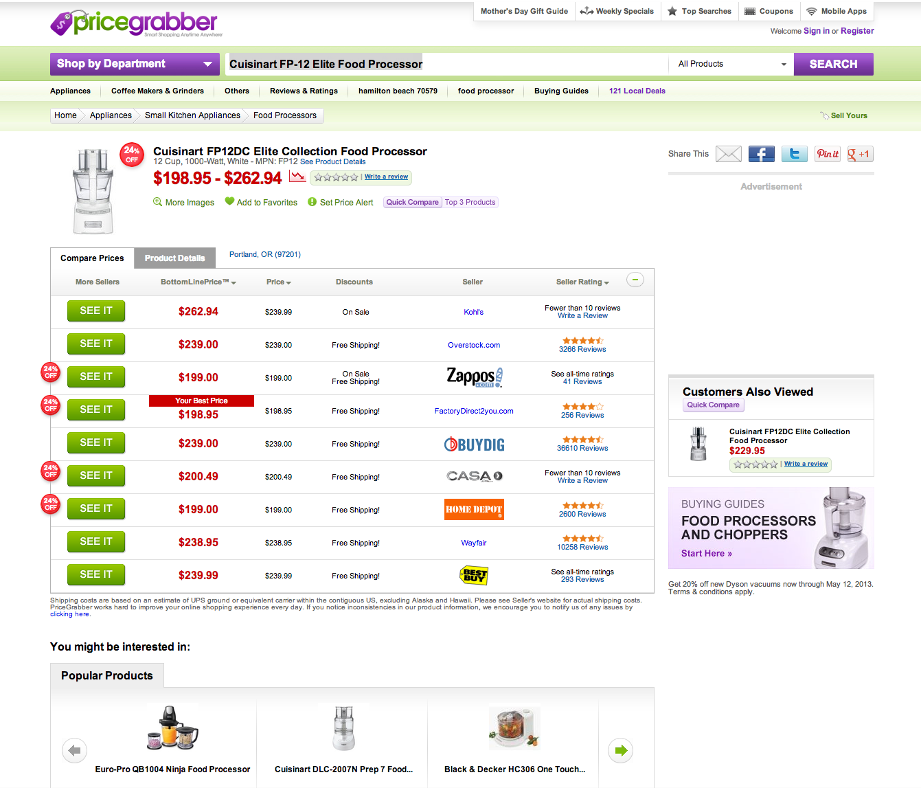 In my search for the “Cuisinart FP-12 Elite Food Processor,” the $184 best price from Amazon.com actually did appear, although only in the black model, not the white which was also $184. The PriceGrabber results for the white model omitted the Amazon.com listing entirely. Macy’s $199 sale price was also missing from the results, although this well-known retailer of housewares appeared in Bing’s free listings.